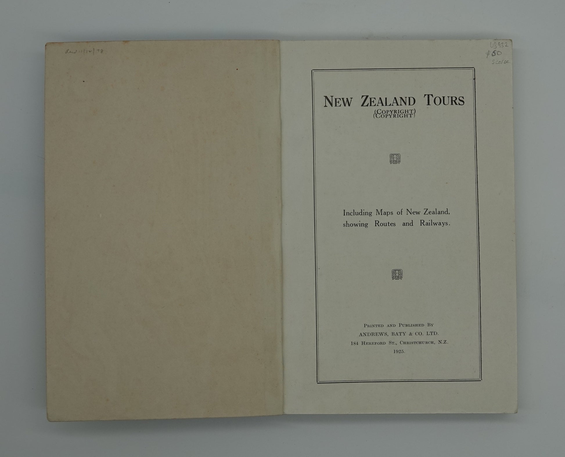 This is a funky collectors artefact. Published by Andrews, Baty & Co of Christchurch it offers travelers of the day a very comprehensive road, railway and steamer guide to our beautiful country. Complete with illustrated advertisements it is a fantastic piece of memorabilia.