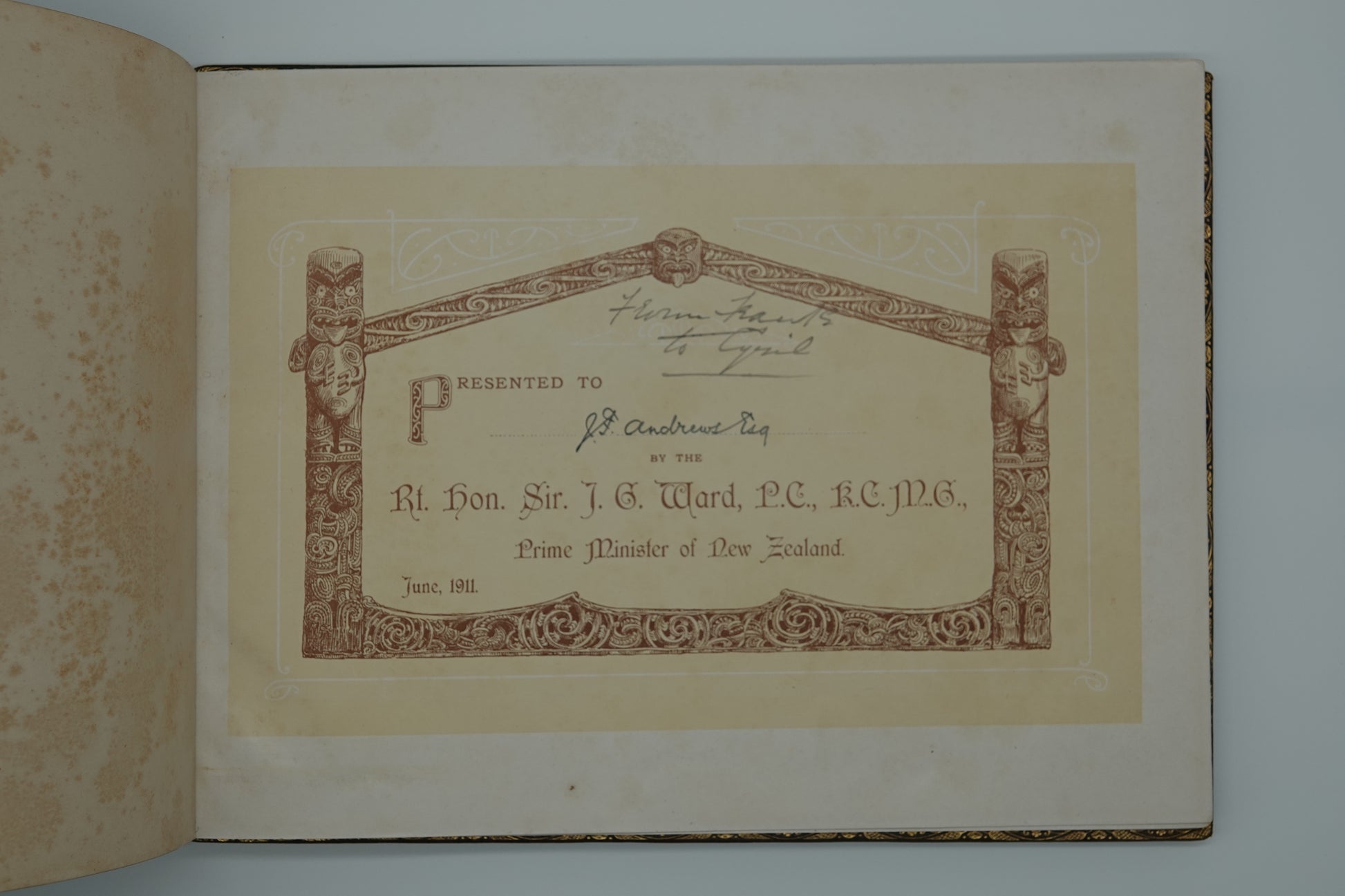 21x29cm Gold tooling, Litho title & presentation leaf, presentation copy inscribed from Sir Josph G Ward, PM to J T Andrews Esq. Oblong folio. Orig. red morocco, gilt edge, marbled end pages.